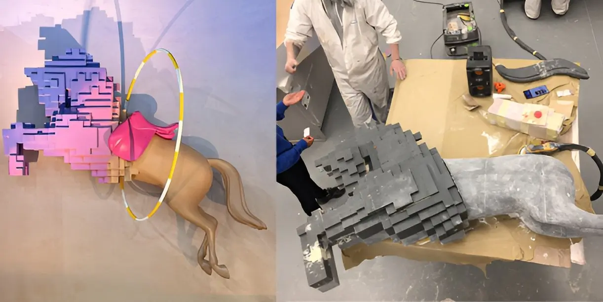 如果你想吸引顧客的眼球,有時你只需要做得大、大膽、色彩鮮豔即可。這就是為什麼 Harlequin 設計了一匹像素化的馬,這匹馬如果沒有 3D 列印的幫助,它永遠不會進入現實世界。 Garside 回憶起這個挑戰:「這匹馬幾乎是真人大小的,而我們沒有太多時間。」他們通常的雕刻方法會過於昂貴且耗時。
