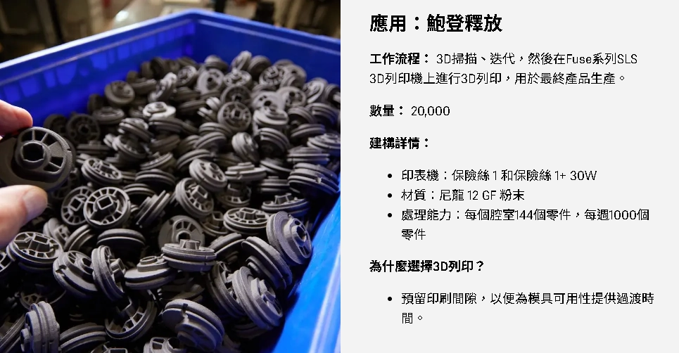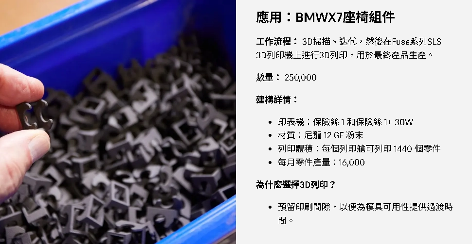 當零件在複雜度、尺寸與需求量上提高時,Brose 就會啟用旗下三台 Fuse 系列 SLS 3D 列印機進行原型與生產作業。SLS 技術透過自支撐粉床能一次列印大量零件,而燒結尼龍所具備的強度與機械特性,也讓它非常適合用於最終成品。